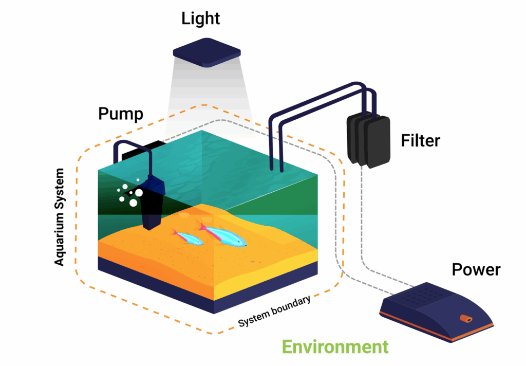 Of course, there are other controls outside of the system. A light bulb goes out, a responsible party replaces it. The utility company provides electricity to the various electronic components, which is wholly outside the system of the “aquarium.” When the system gets out of whack (e.g. an algae bloom), it may require disassembling, cleaning and reassembling to get it back into balance. These controls, called environmental controls, outside the boundary of the aquarium system, monitors the system and inputs and potentially rebuilds the system, altering, adding, replacing or subtracting inputs or components. Sometimes determining the boundaries of the system can be difficult, but it can be important when building a system to figure out what needs to be managed within the system and what the system needs to rely on, externally, being managed. Often, the environment is just a much larger system (e.g. a local ecosystem is part of the Earth’s ecosystem which is part of the Earth/Moon system, which is part of the Solar System, etc…)